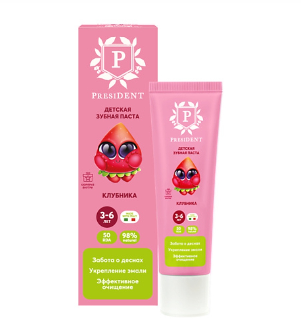 Детская зубная паста PRESIDENT® Клубника от 3 до 6 лет (43 гр.) обеспечивает заботу о деснах, укрепление эмали и эффективное очищение.