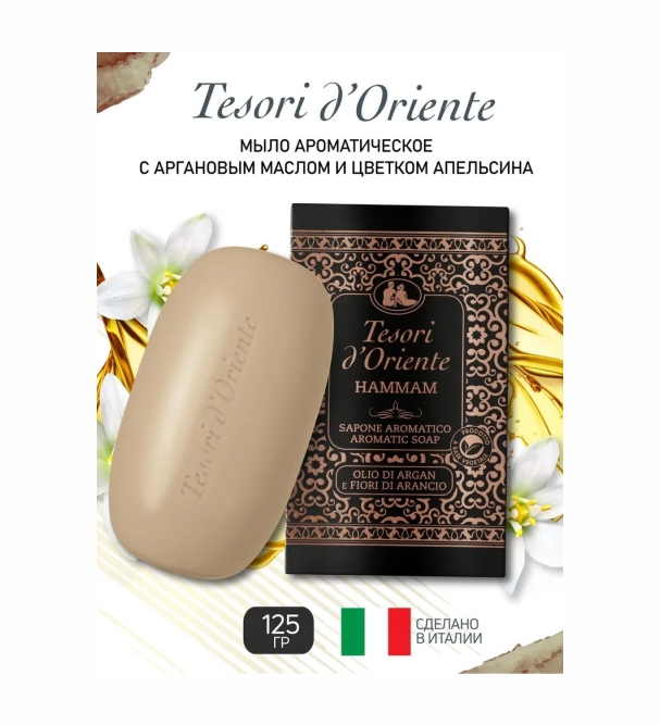 Мыло туалетное Tesori d'Oriente ХАММАМ приглашает Вас окунуться в мир эстетики и великолепия. Итальянские парфюмеры создали кусковое мыло с тонким ароматом цветка апельсина. Аромат создан на основе натуральных масел - масло миндаля, масло арганы, с натуральными компонентами. Крупный удобный кусок 125 грамм в изящной упаковке, подходящей для подарка. Продукция вдохновлена древней идеей превратить ежедневный уход за домом в красивый ритуал, с помощью которого можно гармонизировать тело и душу. Мыло туалетное твёрдое от Tesori d`Oriente удобного большого размера, в составе - уходовые и увлажняющие масла и ингредиенты. Мыло хорошо пенится вплоть до самого маленького обмылочка, и не раскисает в мыльнице Способ применения: