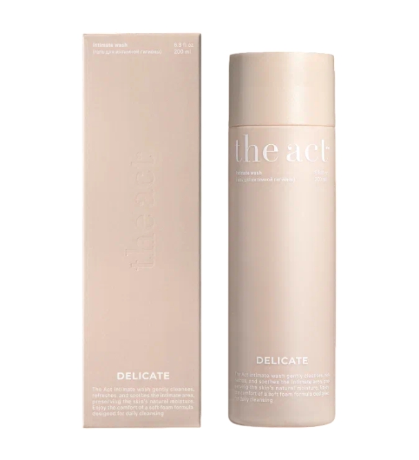 Гель для интимной гигиены The Act Delicate с молочной и гиалуроновой кислотами предназначен для бережного очищения чувствительной кожи интимной зоны. Он поддерживает естественный pH-баланс 3,5, защищая микрофлору от раздражения и воспаления. Гель содержит комплекс пребиотиков-лизатов, которые защищают кислотный и водно-липидный барьеры кожи, предотвращая развитие патогенной микрофлоры. Протеин пшеницы и масло конопли увлажняют и смягчают кожу, молочная кислота освежает и деликатно отшелушивает, а гиалуроновая кислота препятствует потере влаги и обновляет кожу. Экстракты ромашки и центеллы успокаивают и снимают раздражение. Лёгкий природный аромат с нотками бергамота, зелёного яблока и розы дарит чувство свежести и чистоты. Способ применения:
