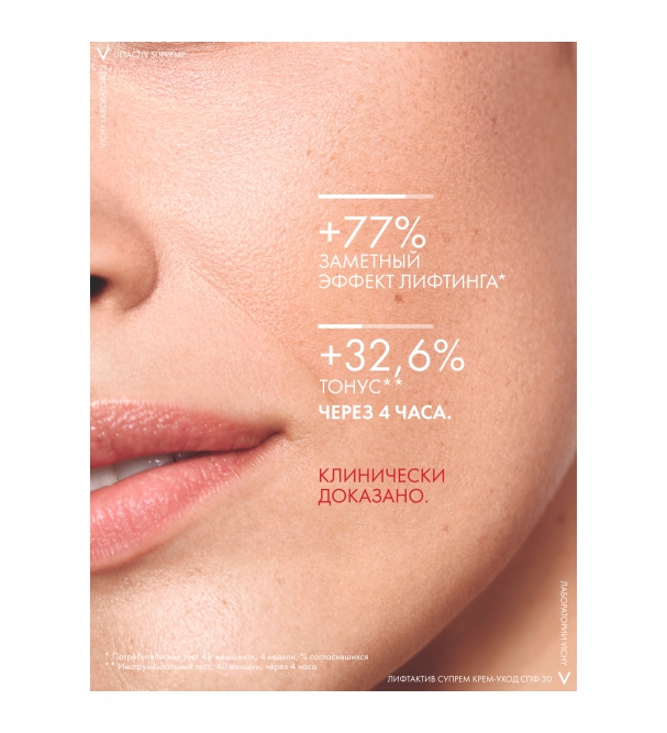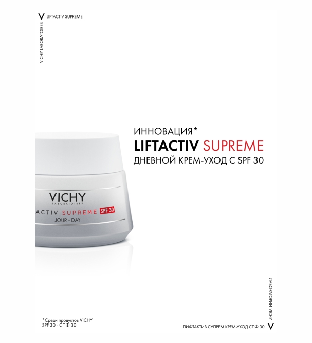 Первый антивозрастной крем-уход LIFTACTIV SUPREME с защитой от солнца SPF 30 / PPD 17,5. Мощные антивозрастные ингредиенты в составе защищают от фотостарения и предотвращают формирование изменений, вызванных негативным воздействием UVA/UVB-лучей.
