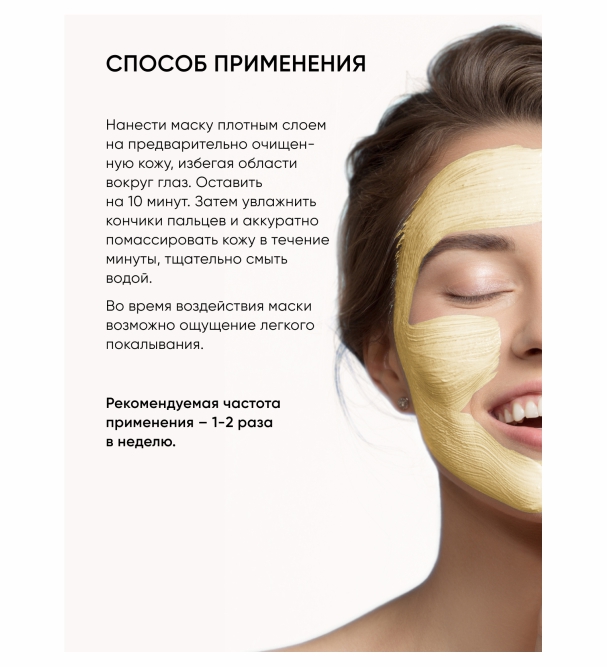 Нанести маску плотным слоем на предварительно очищенную кожу, избегая области вокруг глаз. Выдержать на коже 10-15 минут. По истечении указанного времени увлажнить кончики пальцев водой и аккуратно помассировать кожу в течение минуты. Тщательно смыть остатки маски прохладной водой. После процедуры нанести крем, соответствующий вашему типу кожи. Использовать 1-2 раза в неделю. При повышенной чувствительности кожи рекомендовано сократить время экспозиции вдвое и исключить проведение массажа. Для более выраженного эффекта рекомендуется применять маску совместно с другими средствами серии RE:VITA-C. Состав: