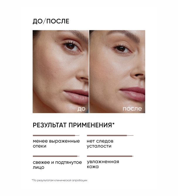 Максимальная эффективность достигается при комплексном применении всех средств лимфодренажной капсулы — маски, тоника и крем-геля для век.