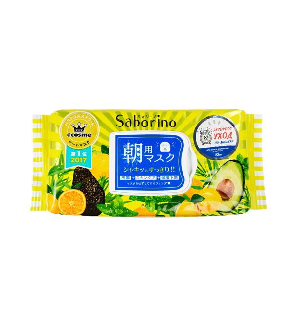 Saborino тканевая маска для лица увлажняющая "Успей за 60 секунд". Saborino - японская тканевая экспресс маска для лица, разработанная специально для утреннего ухода. Каждое утро всего за 60 секунд она будет пробуждать Вашу кожу прохладной свежестью и легкими тонизирующими покалывающими ощущениями. Три этапа ухода - в одной маске: средство для умывыния, тоник и увлажняющая база под макияж. Для кожи склонной к сухости. 3 действия в одной маске: 1. Очищение+ отшелушивание: фруктовые кислоты 2. Сужение пор + снятие утренней отечности: мята, грейпфрут, огурец, масло листьев чайного дерева3. Увлажнение + повышение упругости: коллаген, гиалуроновая кислота, апельсин, авокадо, мед.