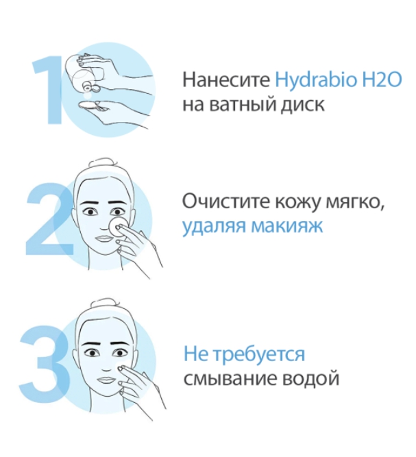 Нанести Гидрабио Н2О на ватный диск и аккуратно протереть кожу лица и контура глаз.