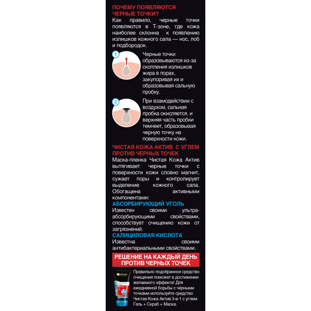 Обогащенная абсорбирующим углем и салициловой кислотой, маска-пленка Чистая Кожа Актив эффективно удаляет черные точки, образованные сальными пробками и остатками загрязнений на лице, особенно в Т-зоне (нос, лоб, подбородок)."