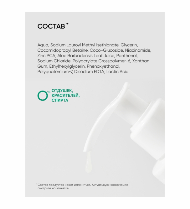 Aqua, Sodium Lauroyl Methyl Isethionate, Glycerin, Cocamidopropyl Betaine, Coco-Glucoside, Niacinamide, Zinc PCA, Aloe Barbadensis Leaf Juice, Panthenol, Sodium Chloride, Polyacrylate Crosspolymer-6, Xanthan Gum, Ethylhexylglycerin, Phenoxyethanol, Polyquaternium-7, Disodium EDTA, Lactic Acid.