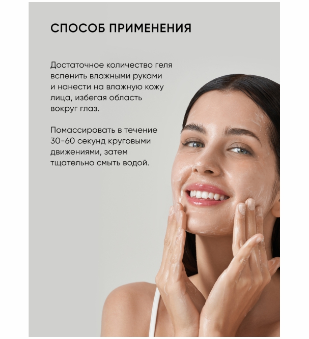Достаточное количество геля вспенить влажными руками и нанести на влажную кожу лица, избегая область вокруг глаз. Помассировать в течение 30-60 секунд круговыми движениями, затем тщательно смыть водой. По желанию завершить процесс очищения тоником. Состав: