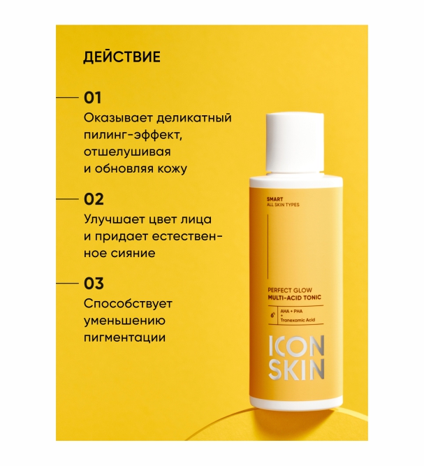 Мультикислотный тоник из серии SMART — средство направленного ухода за кожей, которой требуется эффективное, но мягкое отшелушивание. Наиболее распространенными последствиями недостаточного отшелушивания могут стать: тусклый вид и сероватый цвет кожи, неровный тон, шелушение вследствие обезвоженности, расширенные и/или закупоренные поры и заметные следы акне. Тоник Perfect Glow бережно удаляет с поверхности кожи ороговевшие частицы и способствует улучшению регенерации кожи, уменьшая выраженность проблем и их повторное появление.