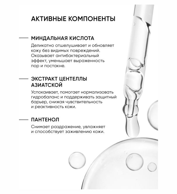 Оптимально сбалансированный состав кислот обновляет и преображает кожу. Формула пилинга включает комбинацию на основе миндальной кислоты, экстракта центеллы азиатской и геля алоэ вера. Благодаря такому сочетанию компонентов пилинг мягко отшелушивает омертвевшие клетки, оказывая противовоспалительный эффект и нормализуя процесс работы сальных желез.