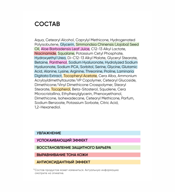 Aqua, Cetearyl Alcohol, Caprylyl Methicone, Hydrogenated Polyisobutene, Glycerin, Simmondsia Chinensis (Jojoba) Seed Oil, Aloe Barbadensis Leaf Juice, C12-13 Alkyl Lactate, Niacinamide, Squalane, Potassium Cetyl Phosphate, Hydroxyethyl Urea, Di-C12-13 Alkyl Malate, Glyceryl Stearate, Betaine, Panthenol, Sodium Hyaluronate, Hydrolyzed Sodium Hyaluronate, Sodium PCA, Sorbitol, Serine, Glycine, Glutamic Acid, Alanine, Lysine, Arginine, Threonine, Proline, Laminaria Digitata Extract, Tocopheryl Acetate, Cera Alba, Ammonium Acryloyldimethyltaurate/VP Copolymer, Cetearyl Glucoside, Dimethicone/Vinyl Dimethicone Crosspolymer, Stearyl Stearate, Tocopherol, Beta-Sitosterol, Squalene, Cera Microcristallina, Ethylhexylglycerin, Phenoxyethanol, Dimethicone, Isohexadecane, Cetearyl Methicone, Parfum, Sodium Benzoate, Potassium Sorbate, Citric Acid, 1,2-Hexanediol.