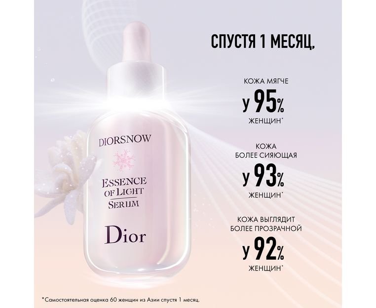 Новая сыворотка Diorsnow Essence of Light - первая сыворотка 4QD* от Dior, которая сочетает осветляющую силу эдельвейса природного происхождения и революционную технологию D-NA Light Reboot**. Активизируя сияние в самом сердце кожи*** она одновременно работает с тоном кожи, текстурой, однородностью и впервые в Dior с прозрачностью.