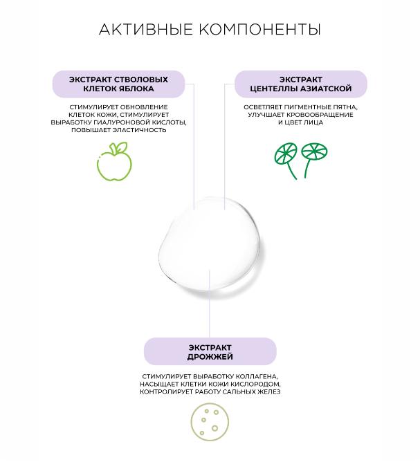 Экстракт стволовых клеток яблока освежит и придаст жизненную силу коже. Подходит для всех типов кожи.