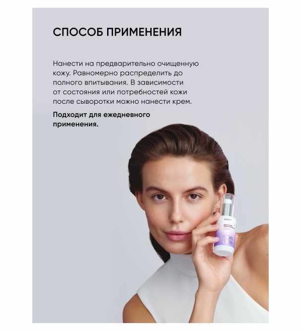 Нанести на предварительно очищенную кожу. Равномерно распределить до полного впитывания. В зависимости от состояния или потребностей кожи после сыворотки можно нанести крем. Подходит для ежедневного применения.