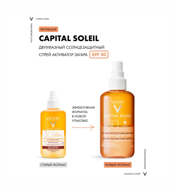 Солнцезащитный спрей-активатор загара VICHY CAPITAL SOLEIL SPF 30 с инновационной* текстурой воды обеспечивает высокую защиту от UVA- и UVB-лучей. Легкая двухфазная формула с бета-каротином и минерализирующей термальной водой VICHY способствует приобретению заметно более интенсивного и равномерного загара. Оставляет на коже легкий сатиновый бархатистый финиш. Не содержит автозагара. Легко наносится и быстро впитывается, не оставляя ощущения липкости. Подходит для всех типов кожи, включая чувствительную. Гипоаллергенно. Протестировано под контролем дерматологов. Устойчивость к воде и песку.