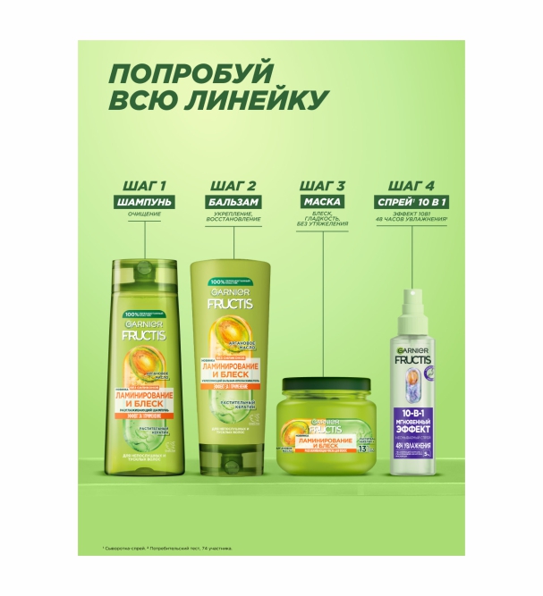 Твои волосы стали непослушными и потеряли естественный блеск? Представляем маску Fructis Ламинирование и Блеск для домашнего ухода за волосами! Формула маски для волос обогащена растительным кератином и аргановым маслом — этот дуэт дарит волосам гладкость, мягкость и ослепительное сияние!