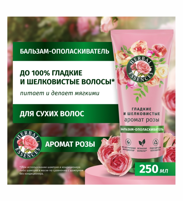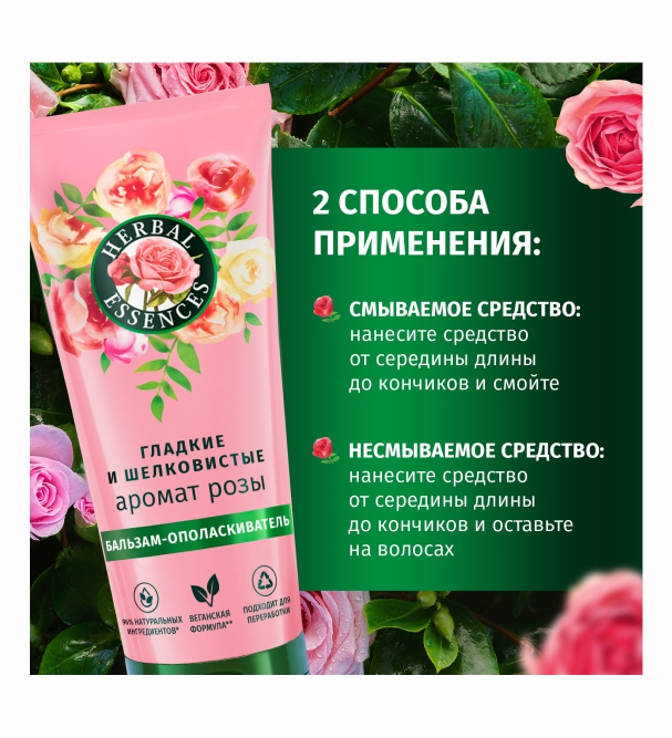 Насладитесь миром в розовых оттенках. Бальзам-ополаскиватель Herbal Essences Аромат розы Гладкие и Шелковистые улучшит состояние сухих волос, делая их мягкими и шелковистыми, а головокружительный аромат розы поднимет настроение и поможет достичь внутренней гармонии. Cмесь растительных питательных нутриентов и эликсир из роз, собранных вручную в парфюмерной столице Франции - Грас, подарят гладкость и легкое расчесывание волосам. Уникальная технология бальзама-ополаскивателя позволяет использовать средство 2 способами: смываемое (нанесите от середины длины до кончиков, затем смойте) и несмываемое (нанесите от середины длины до кончиков и оставьте на волосах). Мы тщательно отбираем ингредиенты природного происхождения, чтобы привнести силу растений в вашу ванную комнату. Восстановите природную красоту волос и превратите уход за волосами в момент наслаждения вместе с коллекцией Аромат Розы Гладкие и Шелковистые. Веганская формула. Область применения: