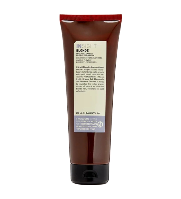 Маска помогает нейтрализовать нежелательные желто-оранжевые пигменты на осветленных волосах. Идеально работает в сочетании с шампунем INSIGHT BLONDE. Комплекс органических компонентов направлен на максимальное питание и увлажнение осветленных волос. Способ применения: