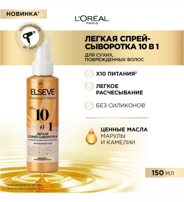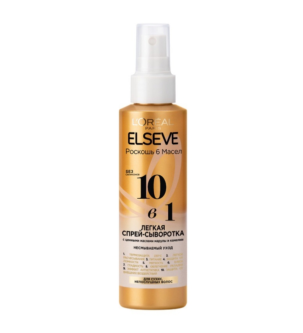 Волосы после частых укладок требуют особого ухода. Есть решение! 10в1 Лёгкая спрей-сыворотка L'Oreal Paris Elseve "Роскошь 6 масел" с ценными маслами марулы и камелии выполняет 10 функций для питания, гладкости и защиты волос. УХОД: