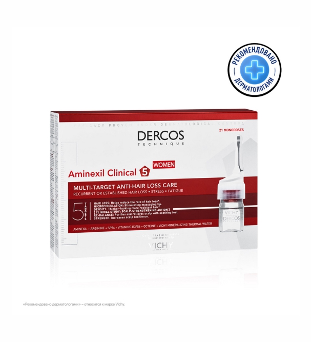 Выпадение волос может быть связано с самыми разнообразными факторами: стрессом, экологией, диетой, изменением гормонального фона (например, после родов и в период менопаузы), сезонным ослаблением организма. Иногда возникшая проблема может усугубиться вследствие неправильного ухода, чрезмерного использования средств для укладки, горячих инструментов, частого окрашивания. Впервые эксперты Лабораторий VICHY установили, что для решения проблемы выпадения волос нужно воздействовать не только на корень волоса, но и на кожу головы, которая может ослабляться под влиянием негативных внешних и внутренних факторов. AMINEXIL Clinical 5 – первое комплексное средство, которое действует на всех уровнях: на корни волос, кожу головы и волокно волоса, помогая эффективно бороться с выпадением волос. Способ применения: