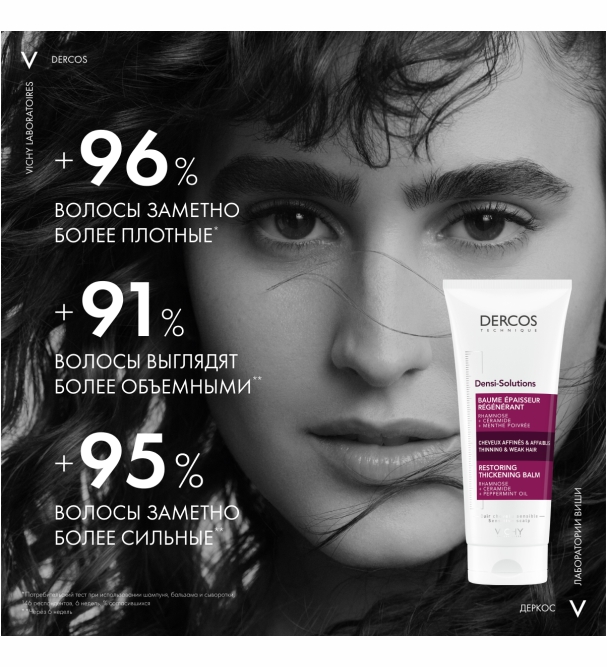 Наши волосы хранят в себе следы негативных воздействий, которым они когда-либо подвергались. Качество волос страдает как от внешних факторов горячей укладки, ультрафиолета, холода или неправильного ухода, так и от внутренних изменений, стресса, гормональных колебаний. Все это может привести к нарушению структуры волокна волоса, переходу части фолликулов в фазу покоя. Стержни волос истончаются, становятся менее прочными и упругими, в результате, прическа теряет объем и густоту. Верните лучшее время Ваших волос с DERCOS DENSI-SOLUTIONS. Эксперты Лабораторий VICHY разработали инновационную гамму средств по уходу за волосами, которая комплексно борется со всеми аспектами проблемы истончения волос. Сыворотка увеличивает количество волос, шампунь повышает их плотность, а бальзам восстанавливает структуру.