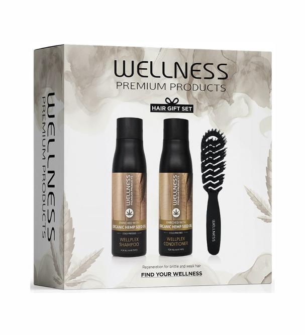 Регенерация для ломких и ослабленных волос. WELLPLEX SHAMPOO 500 мл - Шампунь с новой инновационной формулой, укрепляет внутреннюю структуру волос до трех раз. Он действует как регенерирующее средство, создавая дополнительные водородные и ионные связи внутри структуры волоса. WELLPLEX CONDITIONER 500 мл - кондиционер усиливает действие шампуня, придавая волосам блеск и мягкость. Увлажняет, восстанавливает и герметизирует кутикулу волос. Он дополняет необходимые витамины и питательные вещества, в том числе белки, входящие в состав волос. WELLNESS FLAT Hair BRUSH-SMALL - щетка, которая благодаря уникальной конструкции и широкому расстоянию щетины, без проблем расчесывает даже самые стойкие волосы. Использование: