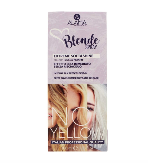 Alama Blonde Spray Extreme Soft & Shine оказывает питательное, реструктуризирующее и распутывающее действие. Он также нейтрализует нежелательные желтые блики, создавая чистый и блестящий блонд.