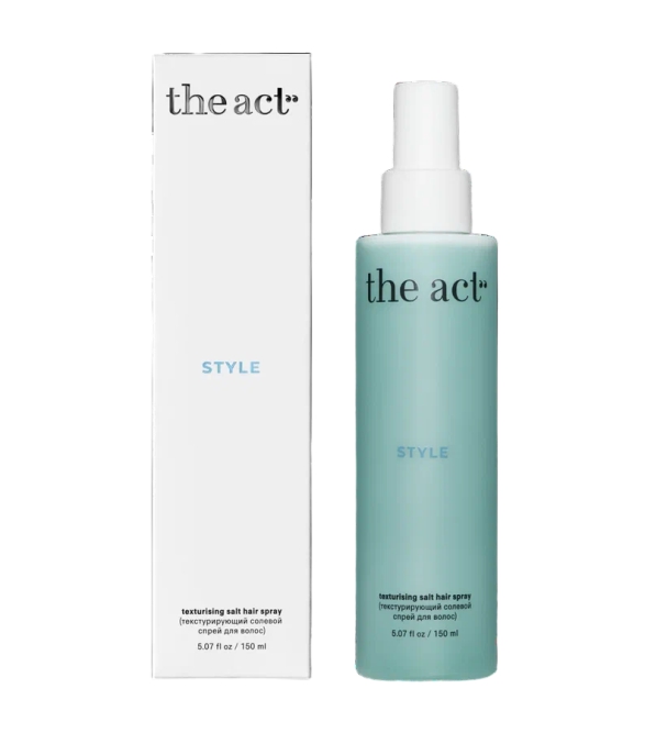 Текстурирующий спрей для волос с морской солью — новинка серии The Act STYLE! Лёгкий и эффективный продукт, который помогает создать эффект естественных, объёмных пляжных локонов без утяжеления и липкости. Подходит для всех типов волос и обеспечивает надёжную и гибкую фиксацию на весь день.